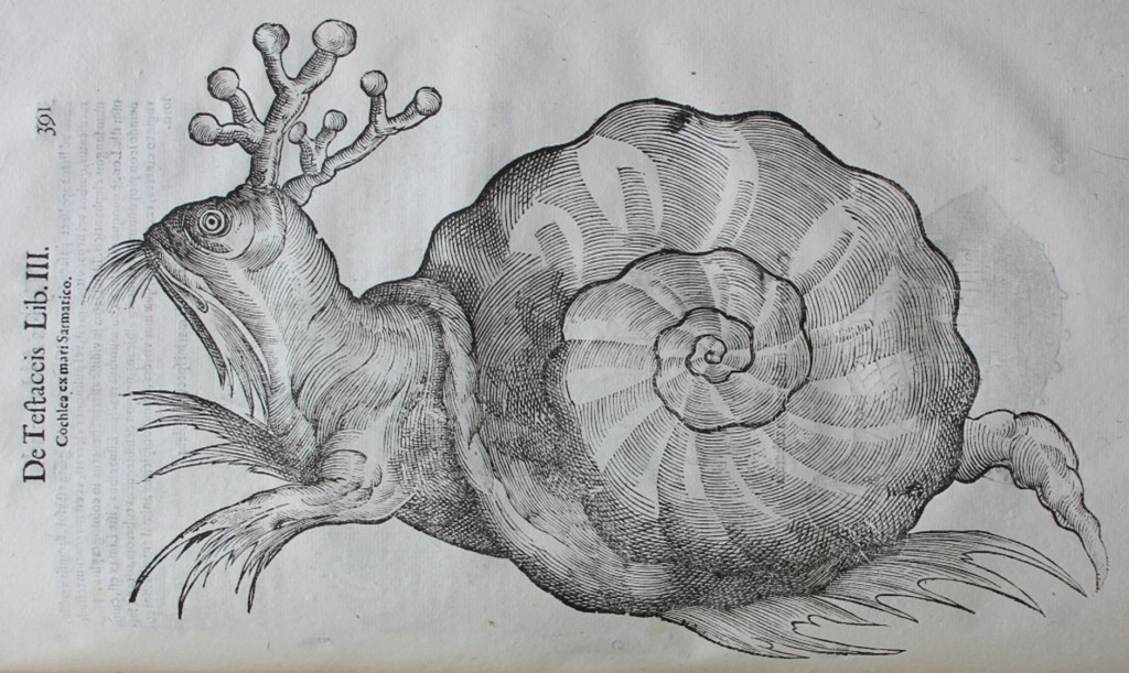 The online exhibition investigates the zoological discoveries of the early modern period as reflected in Worth’s wonderful set of volumes by Aldrovandi. In the main it follows Aldrovandi’s own preoccupations: exploring birds, mammals, amphibians, reptiles, fish, mollusca, crustacea, insects, plants and minerals. Aldrovandi was fascinated by all forms in nature and not only also paid attention to domestic and more exotic specimens, he also included some more mythical animals among his volume of monsters. Many of the latter have been investigated in another Worth Library online exhibition: Mythical Creatures at the Edward Worth Library but some, such as the following ‘Sarmatian Sea Snail’, may be found lurking in Aldrovandi’s volume dealing with mollusca and crustacea!